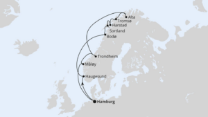 Hamburg – Haugesund – Bodø – Sortland – Harstad – Tromsø – Alta – Trondheim – Måløy – Hamburg